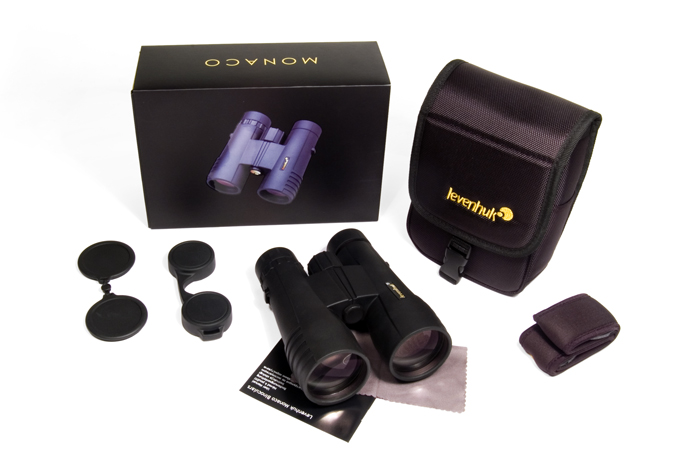 - The kit of all Levenhuk Monaco binoculars (except for Monaco 10x25 model) includes protective caps for objective lenses and eyepieces, a nylon pouch and a cleaning wipe, so that you can take these binoculars on your travels and properly care for them throughout the journey.
