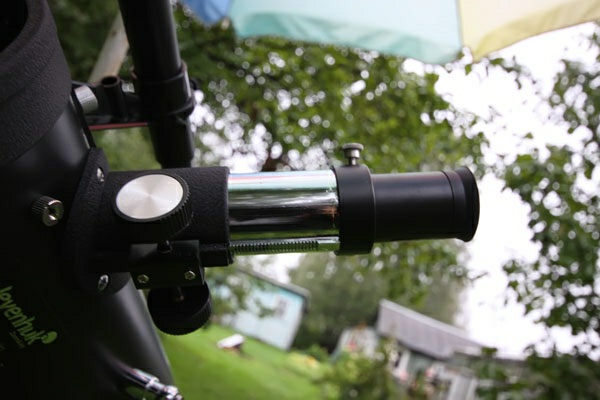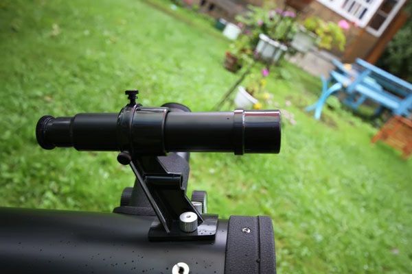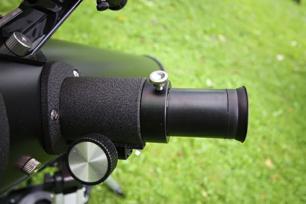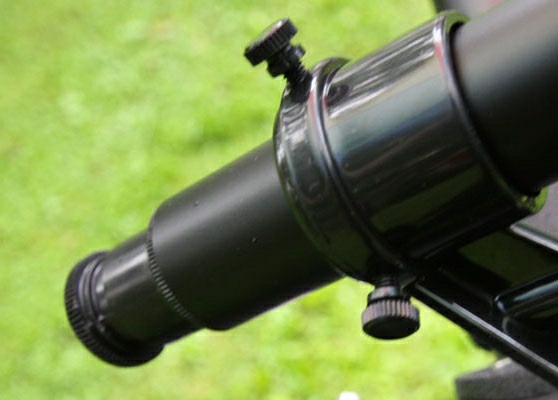 The finderscope is made of plastic. It is attached to the tube with two large screws. For accurate alignment of the finderscope, point the telescope at some distant object, and then align the images provided by the main telescope and the finderscope together, using the adjustment screws on the body. The adjustment screws are also made of plastic.