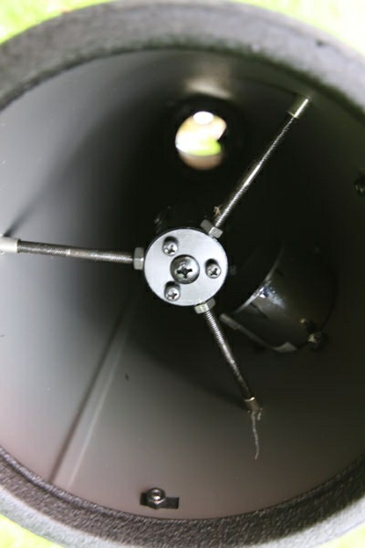 The sturdy metal rods of the spider inside the tube hold the secondary mirror in place. The spider vanes are used for the secondary mirror offset which can be done during collimation. The secondary mirror cell is equipped with three screws for orientation and one central locking screw. These screws are used for the collimation of the telescope's optical system.