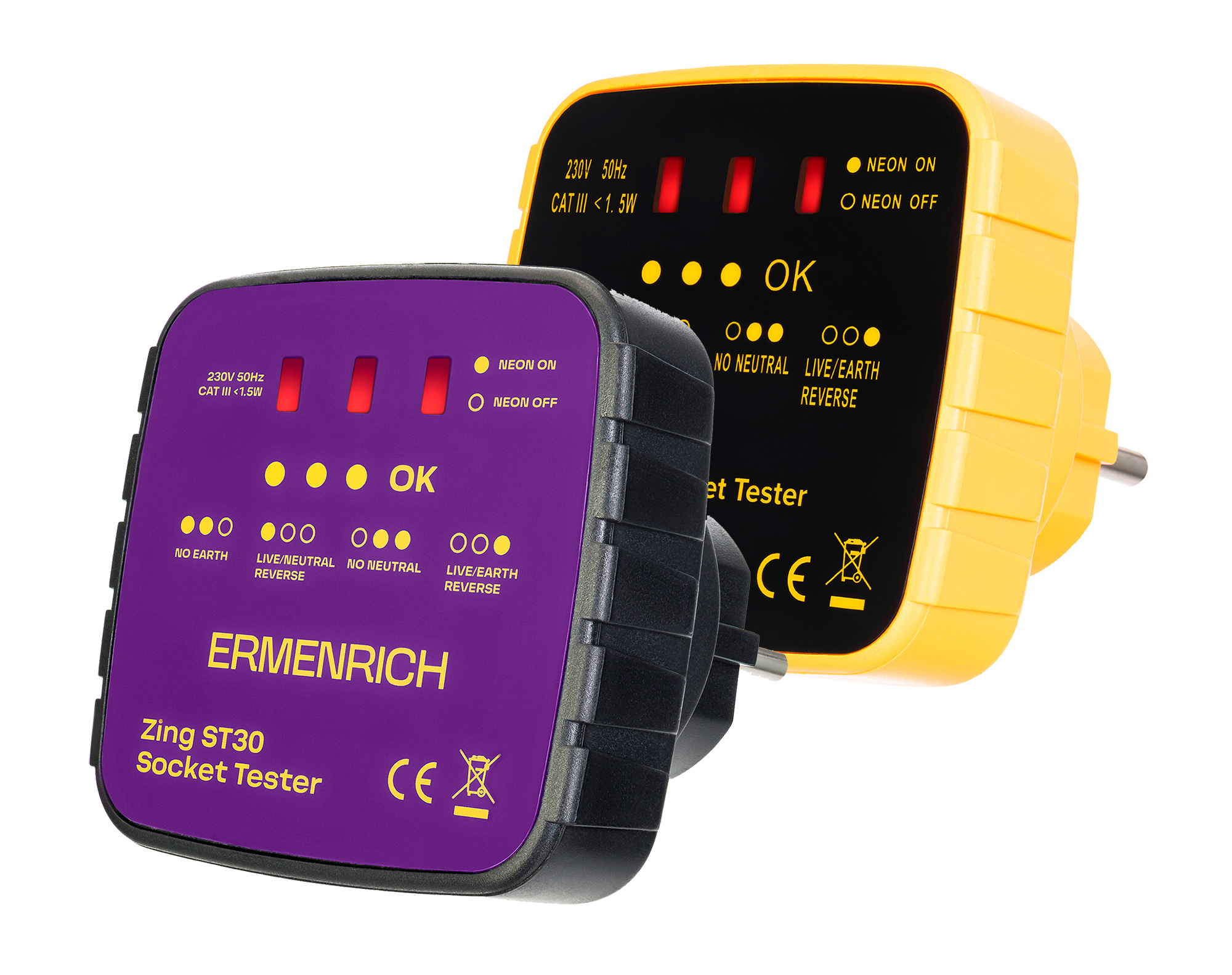 Ermenrich Zing ST30 Priz Test Cihazı, tüm prizlerin kablo bağlantılarının düzgün şekilde yapılıp yapılmadığını test etmek ve voltajı kontrol etmek için tasarlanmıştır. Test cihazı doğrudan bir prize takılmalıdır ve LED'in yanıp sönmesi çeşitli elektrik arızalarını gösterecektir: toprak yok/nötr yok, elektrik yüklü/nötr ters veya elektrik yüklü/toprak ters. Ek olarak, test cihazı ekranında görünen özel renk kodu, doğru kablolama durumunu gösterir. Her kodun işlevi cihaz üzerinde yazılıdır.
