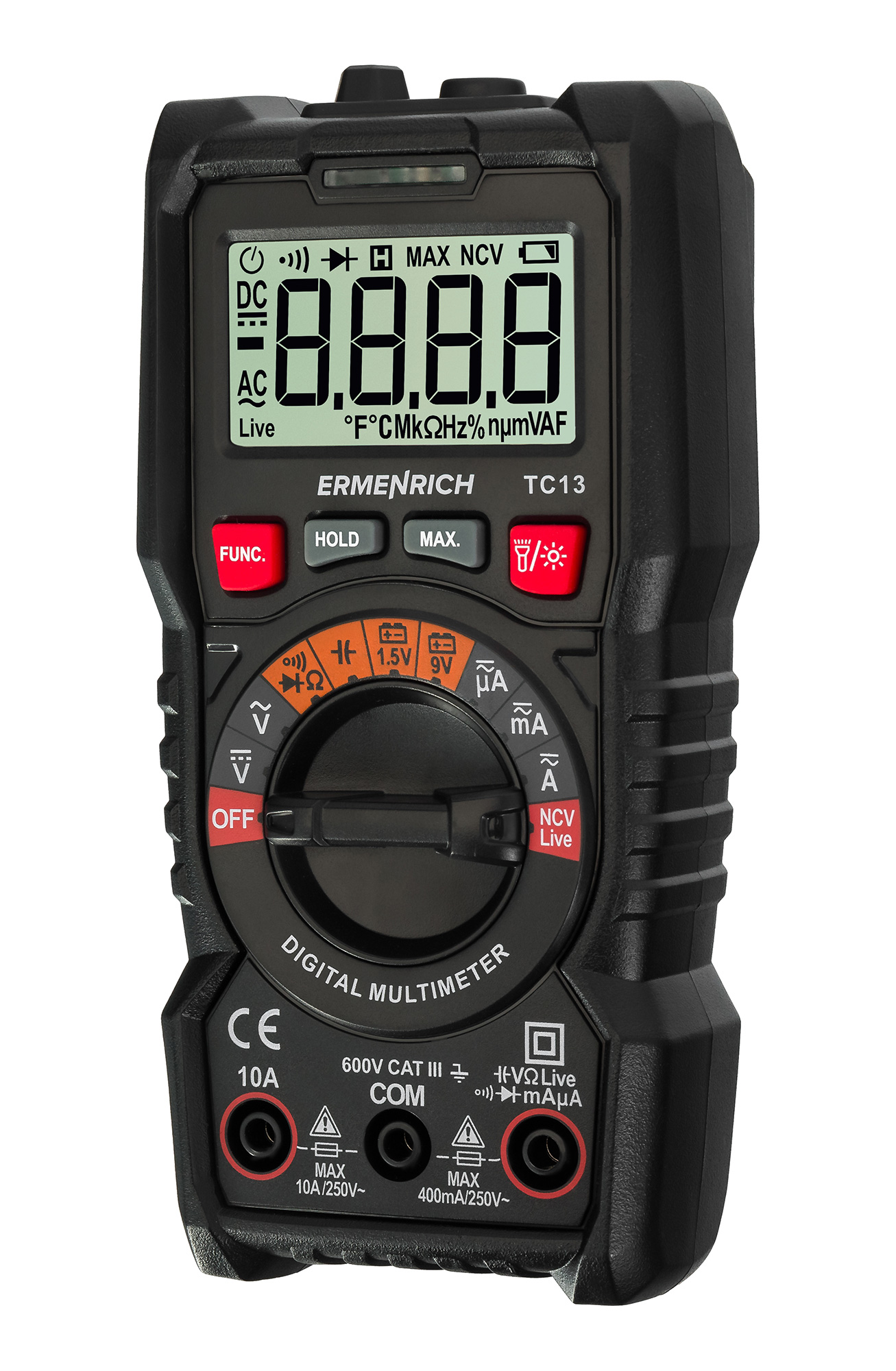 Ermenrich Zing TC13 dijital multimetre, elektrik ağlarını test etmek ve elektrik sinyalinin özelliklerini ölçmek için kullanılan çok işlevli, taşınabilir bir araçtır. Cihaz, teknisyenler tarafından profesyonel kullanım için tasarlanmıştır ancak ev işleri için uzman olmayan kişilere de uygun olabilir. Ermenrich Zing TC13, voltaj, akım ve direncin yanı sıra kapasitans, frekans ve görev döngüsünü de ölçebilir.