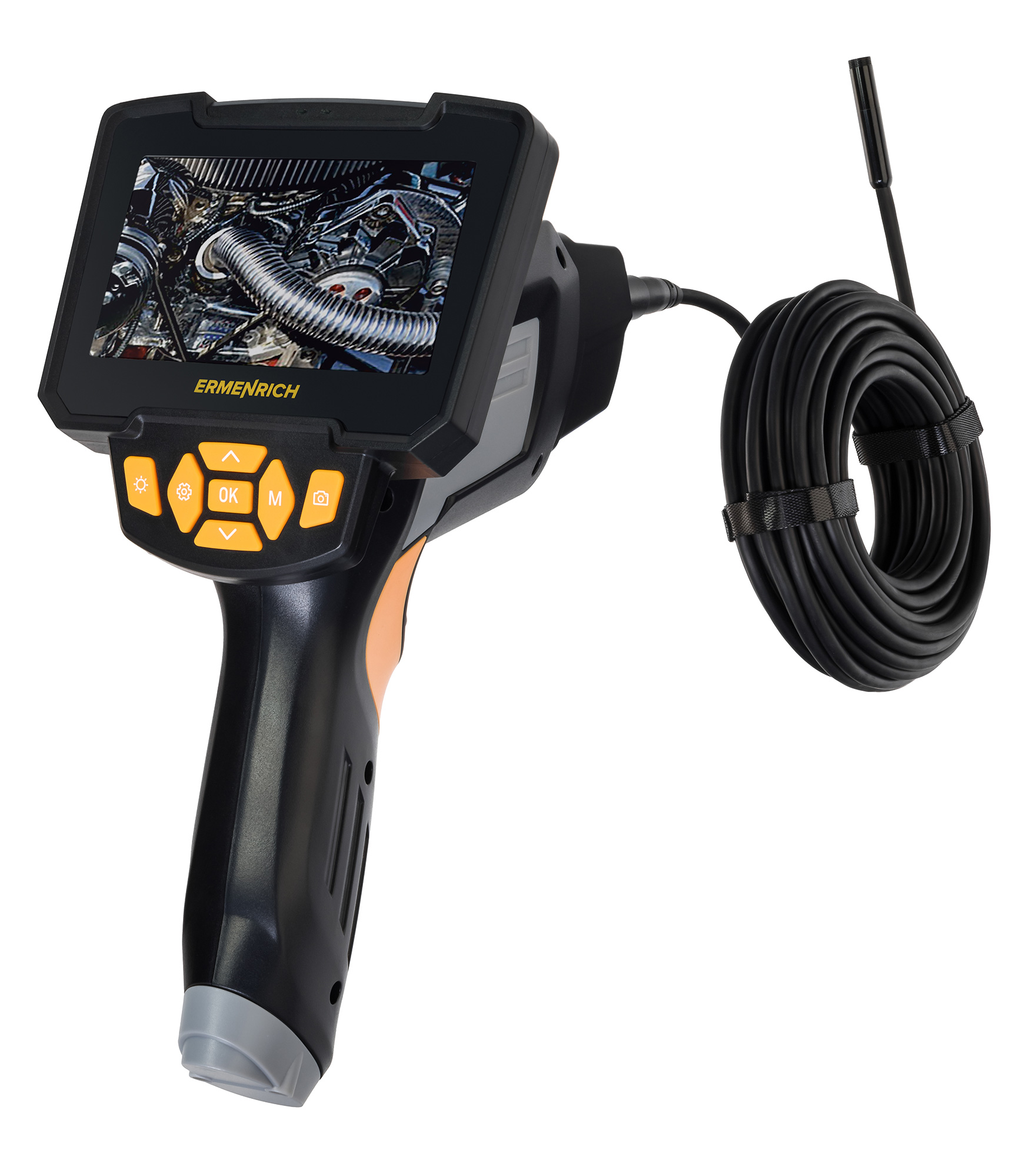 Ermenrich Seek VE50, 70° görüş açısı sağlayan 5,5 mm HD kameralı endüstriyel bir endoskoptur (boroskop). Bu cihazla, 10 metre uzunluğundaki esnek kaz boynu sayesinde ulaşılması zor noktaları incelemek kolaydır. Bunlar, ev içi borular, duvarların içindeki boşluk, içten yanmalı motor, bir konteynerdeki kargo vb. olabilir.Endoskop evde ve profesyonel amaçlarla kullanılabilen kolay ve etkili bir araçtır.